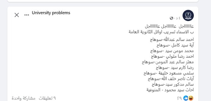 انتشر على مواقع التواصل الاجتماعي فيس بوك، مجموعة من أسماء أوائل طلاب الثانوية العامة للعام الدراسي الحالي 2023-2024 تزعم أنها أسماء الطلاب للعام الحالي.