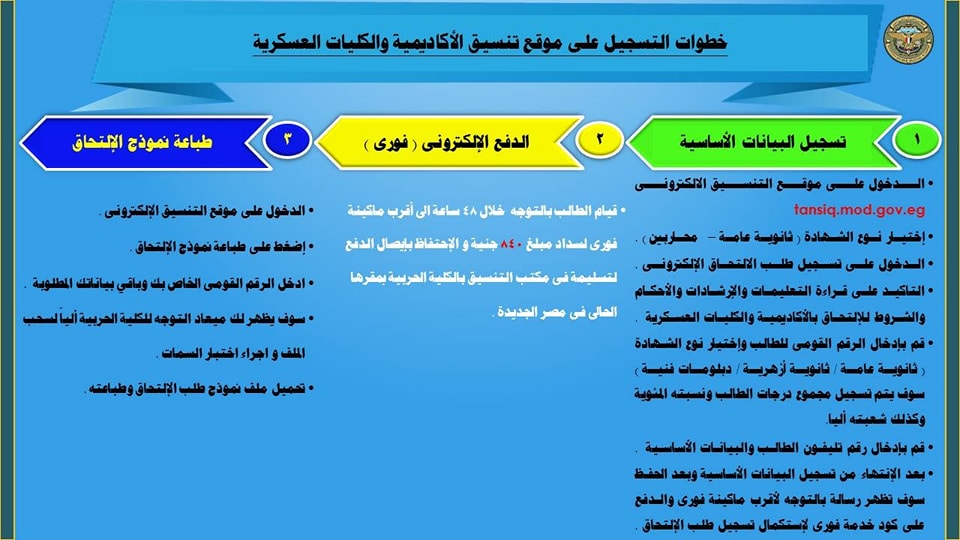- استكمال تسجيل رغبات الطلاب على موقع تنسيق الكليات العسكرية يتطلب ضرورة السداد الإلكتروني.