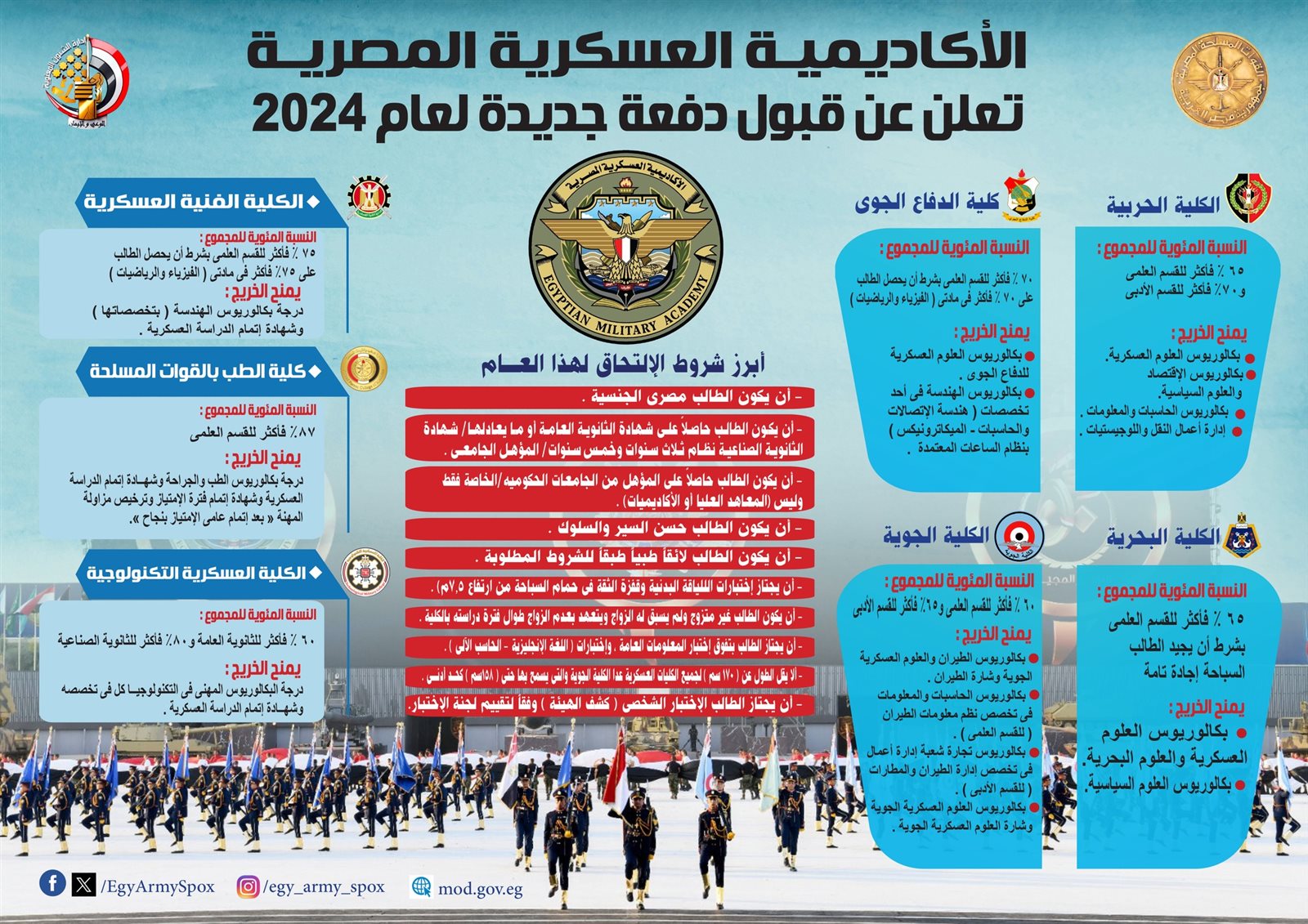 يخاطب تنسيق الكليات العسكرية 2024، طلاب الثانوية العامة والثانوية الأزهرية وطلاب الثانوية الصناعية، وقد جاءت النسبة المئوية بالحد الأدنى لقبول الطلاب بالكليات العسكرية كالتالي: