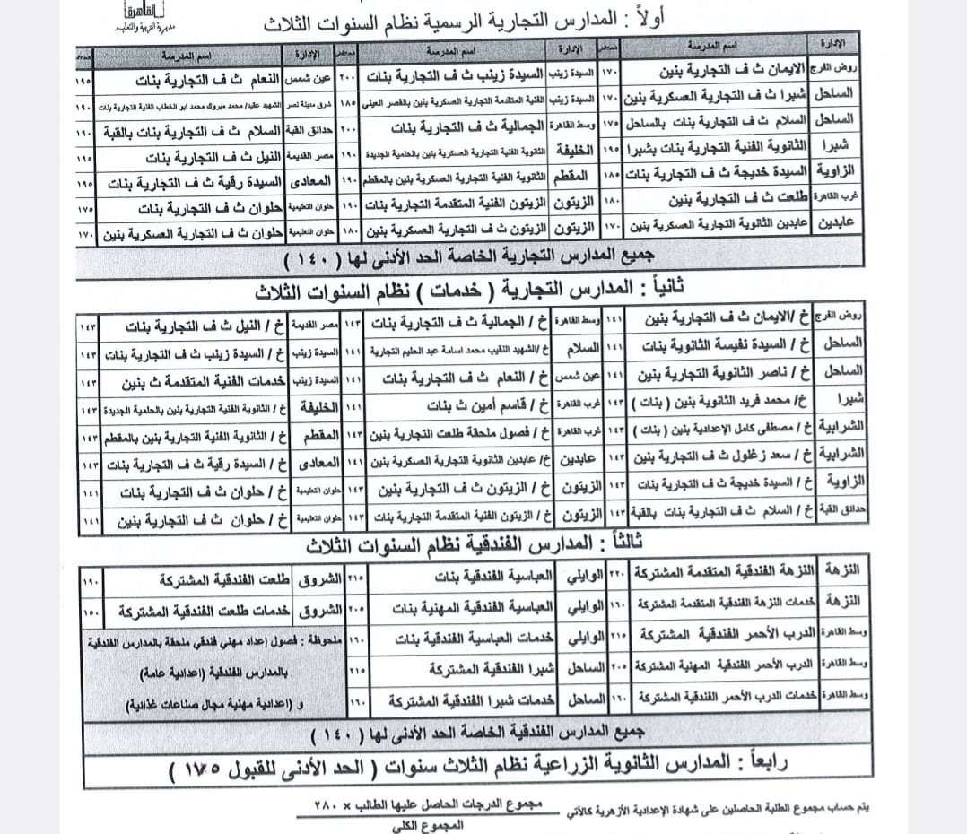 قرر الدكتور إبراهيم صابر، محافظ القاهرة، النزول بدرجة الحد الأدنى لتنسيق القبول بمدارس التعليم الفني: صناعي- تجاري- فندقي- زراعي، للعام الدراسي الجديد، بالمدارس التي يوجد بها أماكن شاغرة.
