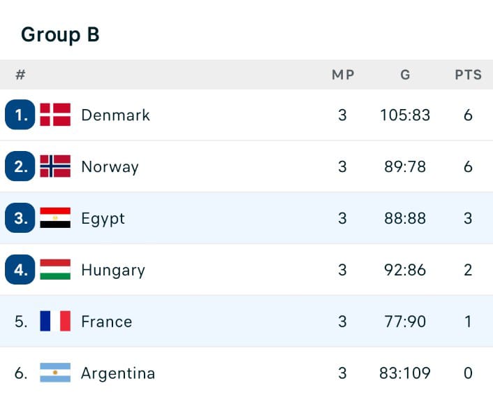 فاز منتخب مصر على منتخب المجر في أولى مباريات المجموعة بنتيجة، 32-35، وفي المباراة الثانية خسر منتخب اليد أمام نظيره منتخب الدنمارك بنتيجة 30-27، وفي المباراة الثالثة تعادل منتخب مصر أمام نظيره الفرنسي بنتيجة 26 -26.