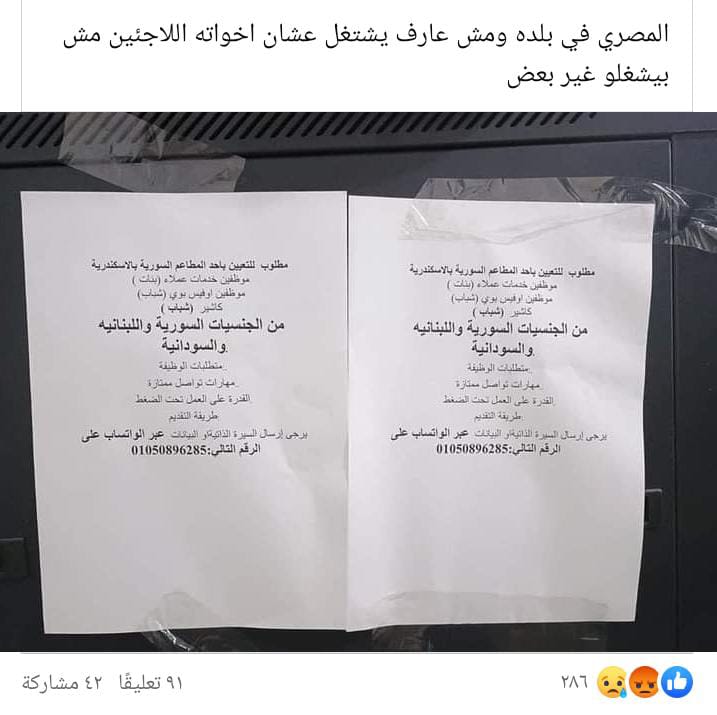 انتشر إعلان توظيف لأحد المطاعم السورية في الإسكندرية، على وسائل التواصل الاجتماعي، يطلب تعيين موظفين من الجنسيات السورية والسودانية واللبنانية، ما أثار الجدل بين رواد مواقع التواصل الاجتماعي، واعتبر الكثيرون أن الأمر مهين للمصريين الذين من حقهم أن يحصلوا على وظيفة في بلدهم، فكان التعليق المتداول هو: المصري في بلده ومش عارف يشتغل علشان اخواته اللاجئين مش بيشغلوا غير بعض.