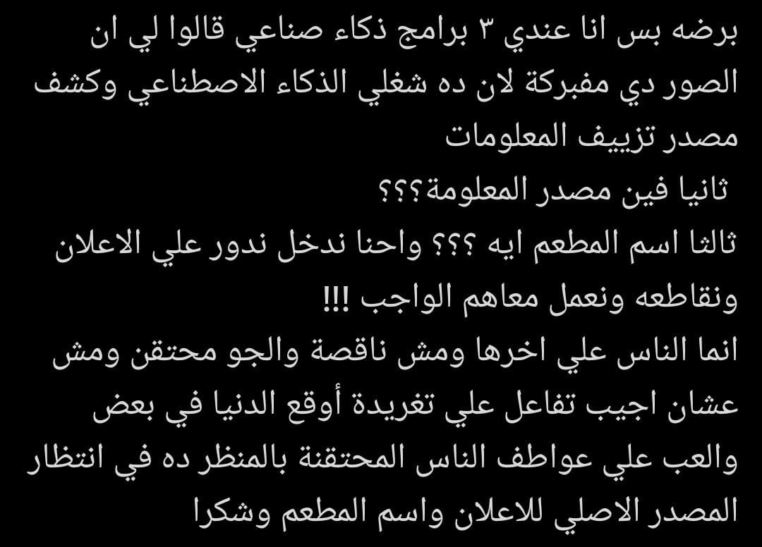 وأجمع الأغلبية العظمى من الناس، على أن المنشور غرضه إثارة الفتنة بين المصريين والجنسيات الآخرى المقيمة في مصر، وأنه في الحقيقة مفبرك، ولم يعلن صاحب الإعلان حتى اسم المطعم الذي يدعو الناس للتقديم على الوظيفة، ونشر صاحب أحد الحسابات على صفحته الشخصية على منصة x، أنه راسل الرقم المذكور في الإعلان عبر واتس آب، ولكن أتاه الرد بأن الرقم خاطئ وتم استخدامه في الإعلان لكن صاحبه ليس لديه أي فكرة عن المطعم المذكور.