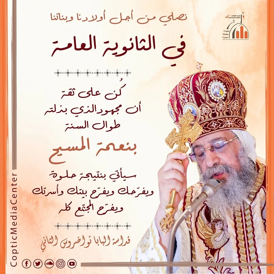 قالت الصفحة الرسمية للمركز الإعلامي القبطي للكنيسة الأرثوذكسية، إن البابا تواضروس الثاني، بابا الإسكندرية وبطريرك الكرازة المرقسية، يصلي من أجل طلاب الثانوية العامة.