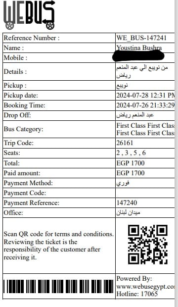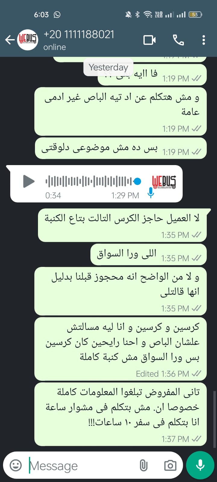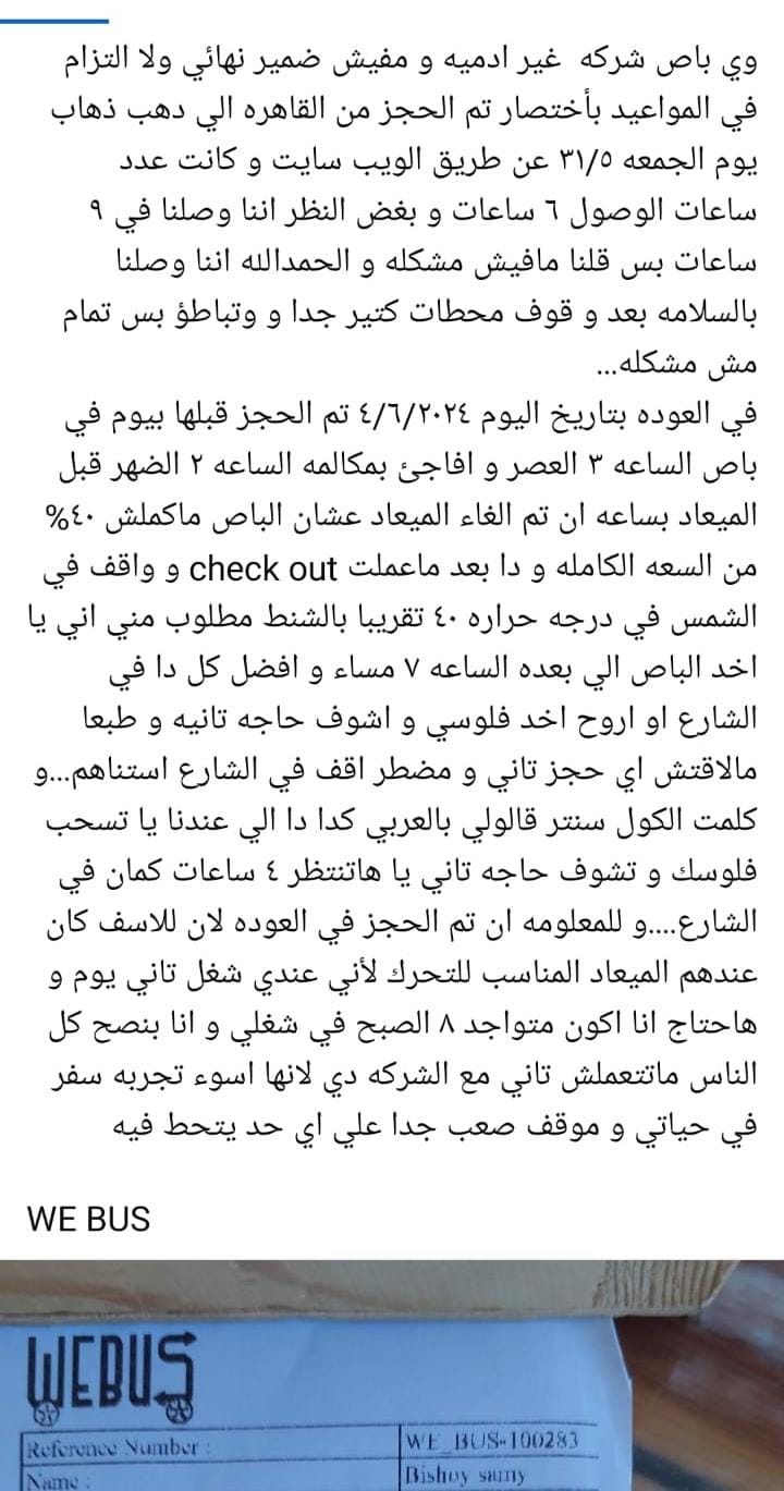 اشتكت سيدة تدعى يوستينا بشرى من شركة we bus للرحلات، مؤكدة أن حافلات الشركة غير آدمية والسائقين غير متزنين، بالإضافة إلى عدم ردهم على شكاوى العملاء.