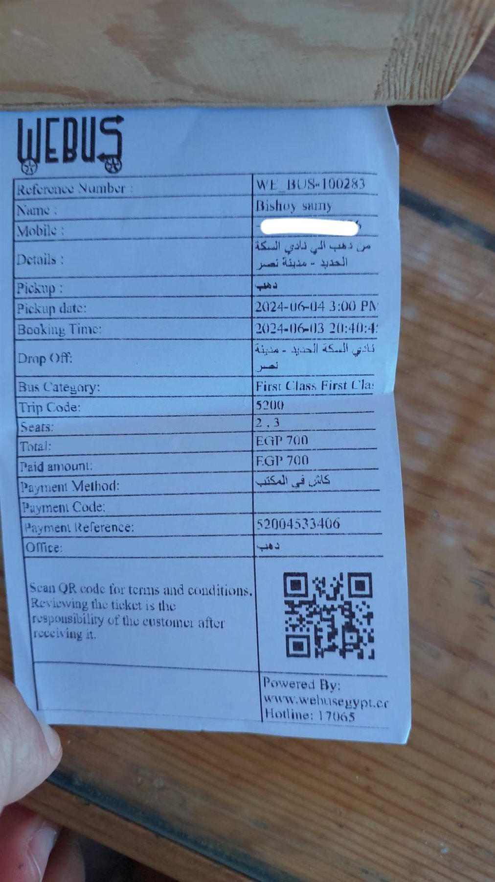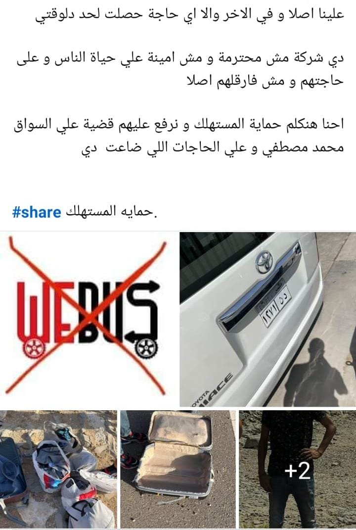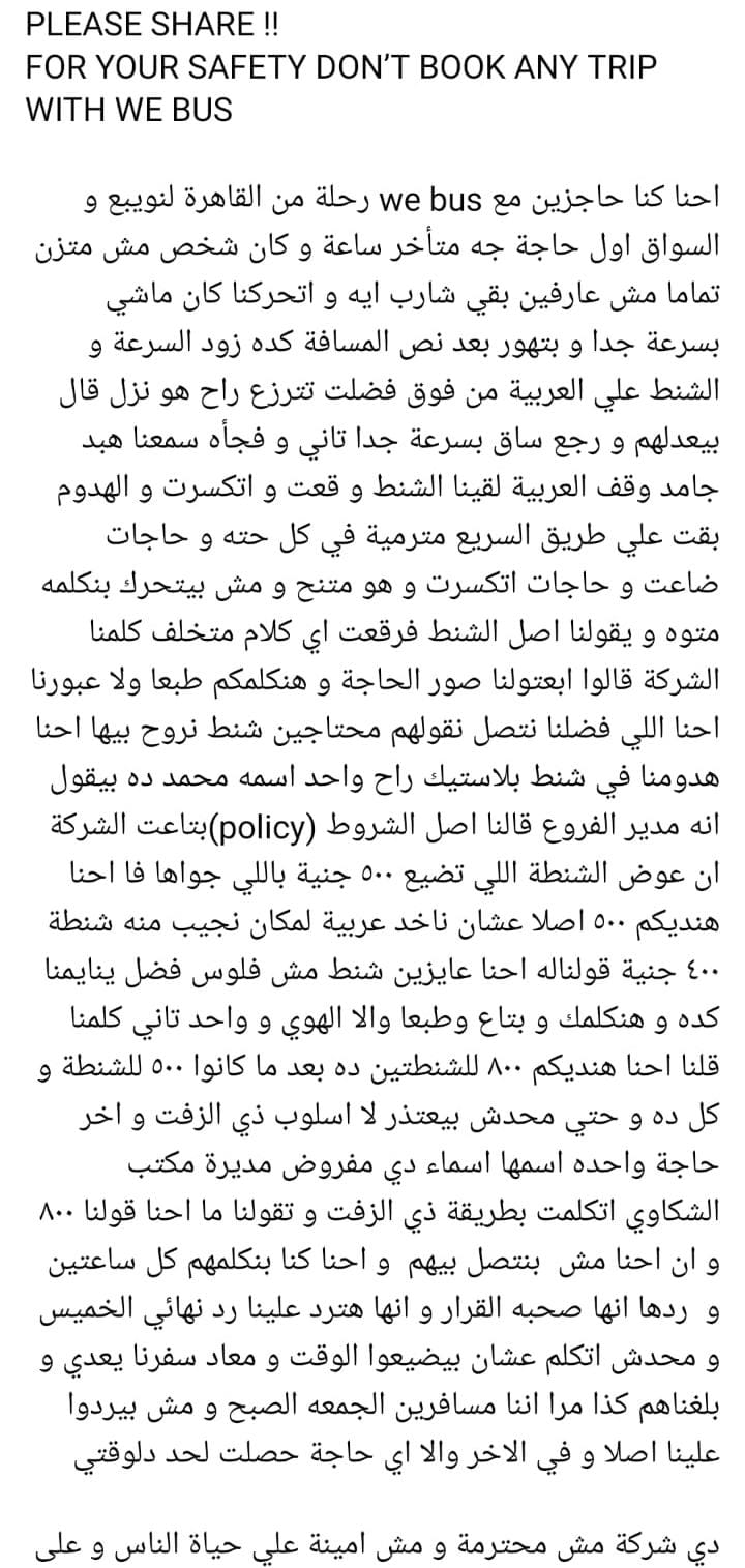 بالإضافة إلى عميل آخر، نشر عبر وسائل التواصل الاجتماعي شكواه ضد شركة وي باص، قائلًا: إحنا كنا حاجزين مع we bus رحلة من القاهرة لنويبع والسواق أول حاجة جه متأخر ساعة وكان شخص مش متزن تماما مش عارفين بقي شارب إيه واتحركنا كان ماشي بسرعة جدًا وبتهور بعد نص المسافة كده زود السرعة والشنط على العربية من فوق فضلت تترزع راح هو نزل قال بيعدلهم ورجع ساق بسرعة جدا تاني وفجأة سمعنا هبد جامد ووقف العربية لقينا الشنط وقعت واتكسرت والهدوم بقت على طريق السريع مرمية في كل حتة وحاجات ضاعت وحاجات اتكسرت وهو متنح ومش بيتحرك بنكلمه نلاقيه تايه ويقولنا أصل الشنط فرقعت، كلمنا الشركة قالوا ابعتولنا صور الحاجة وهنكلمكم طبعا ولا عبورنا إحنا اللي فضلنا نتصل نقولهم محتاجين شنط نروح بيها إحنا هدومنا في شنط بلاستيك راح واحد اسمه محمد ده بيقول إنه مدير الفروع قالنا أصل الشروط (policy) بتاعت الشركة إن عوض الشنطة اللي تضيع ٥٠٠ جنيه باللي جواها فا إحنا هنديكم ٥٠٠ أصلا عشان ناخد عربية لمكان نجيب منه شنطة بـ٤٠٠ جنيه قولناله إحنا عايزين شنط مش فلوس فضل بماطل فينا.