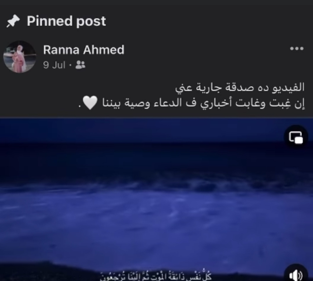 ونشرت صديقات رنا أحمد حلمي الطالبة بكلية الآداب جامعة المنوفية، فيديو كانت قد وضعته الراحلة صدقة على روحها يحمل آية، كل نفس ذائقة الموت ثم إلينا ترجعون، وثبتت الفيديو على صفحتها الشخصية وكتبت عليه ده صدقة جارية عني إن غبت وغابت أخباري فالدعاء وصية بيننا.