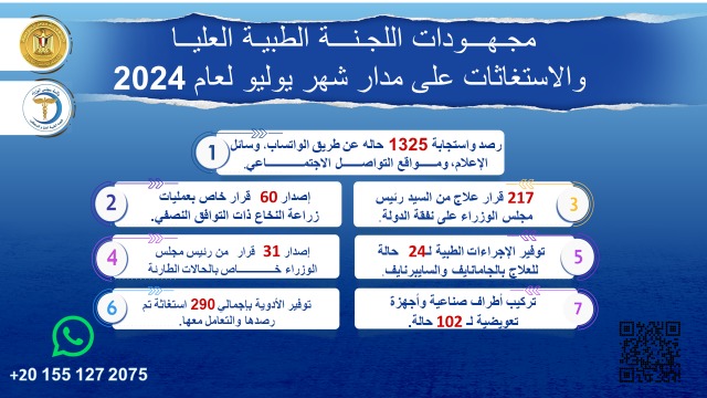 وخلال التقرير، أشار الدكتور حسام المصري، إلى أن جهود اللجنة الطبية العليا خلال شهر يوليو الماضي، تضمنت الاستجابة لعدد 1325 حالة تم رصدها عن طريق تطبيق واتس آب ووسائل الإعلام ومواقع التواصل الاجتماعي المختلفة.
