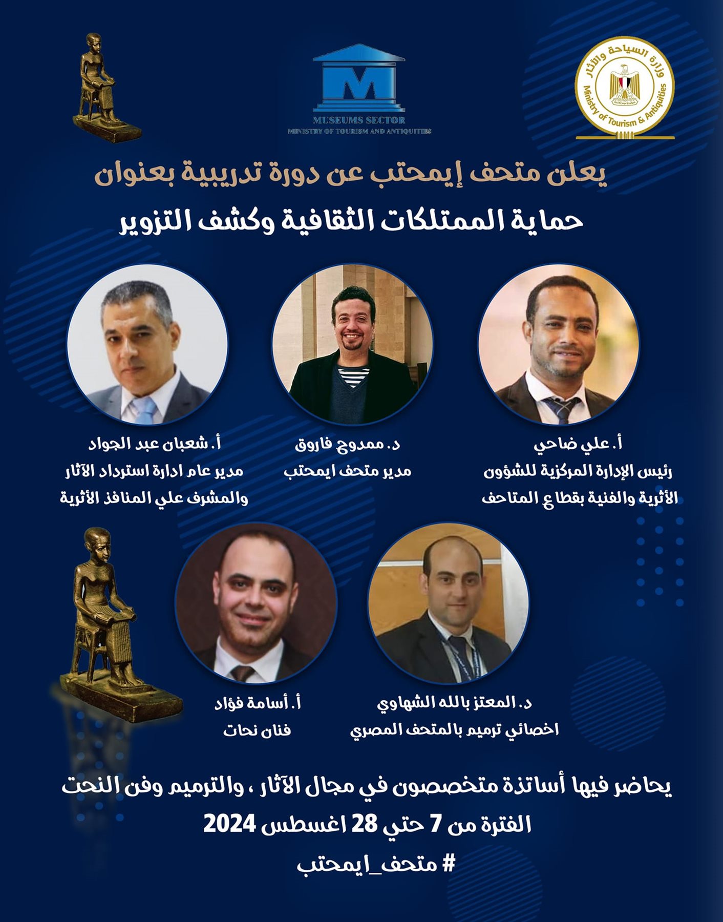 يدشن متحف إيمحتب بسقارة، دورة تدريبية توعوية مجانية بعنوان حماية الممتلكات الثقافية وكشف التزوير وذلك بمقر متحف إيمحتب أيام، 7، 14، 21، 28 أغسطس 2024، وذلك في إطار الدور المؤسسي والمجتمعي لمتحف إيمحتب في نشر الوعي الأثري والسياحي للشرائح المختلفة من المجتمع المصري.