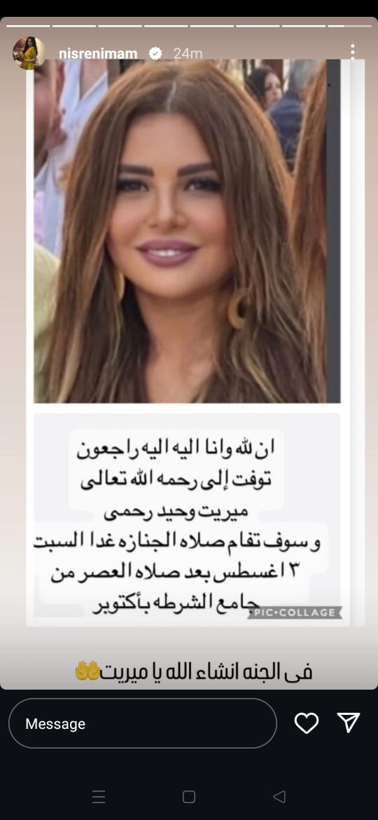ونشرت نسرين أمين، صورة الراحلة ميريت رحمي، عبر ستوري حسابها الشخصي بموقع تبادل الصور والفيديوهات إنستجرام، وكتبت: إنا لله وإنا إليه راجعون.. توفت إلى رحمة الله ميريت وحيد رحمي، وتقام صلاة الجنازة السبت 3 أغسطس، عقب صلاة العصر في جامع الشرطة بـ أكتوبر.. في الجنة إن شاء الله يا ميريت.