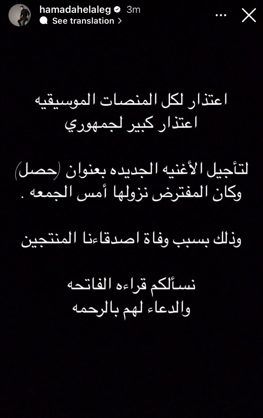 ونشر حمادة هلال عبر خاصية القصص القصيرة بـ حسابه الرسمي بموقع تبادل الصور والفيديوهات انستجرام قائلًا: اعتذر لكل المنصات الموسيقية، ولجمهوري، لتأجيل الأغنية الجديدة بعنوان حصل وكان المفترض نزولها أمس الجمعة، وذلك بسبب وفاة أصدقاءنا المنتجين، نسألكم قراءة الفاتحة والدعاء لهم بالرحمة.