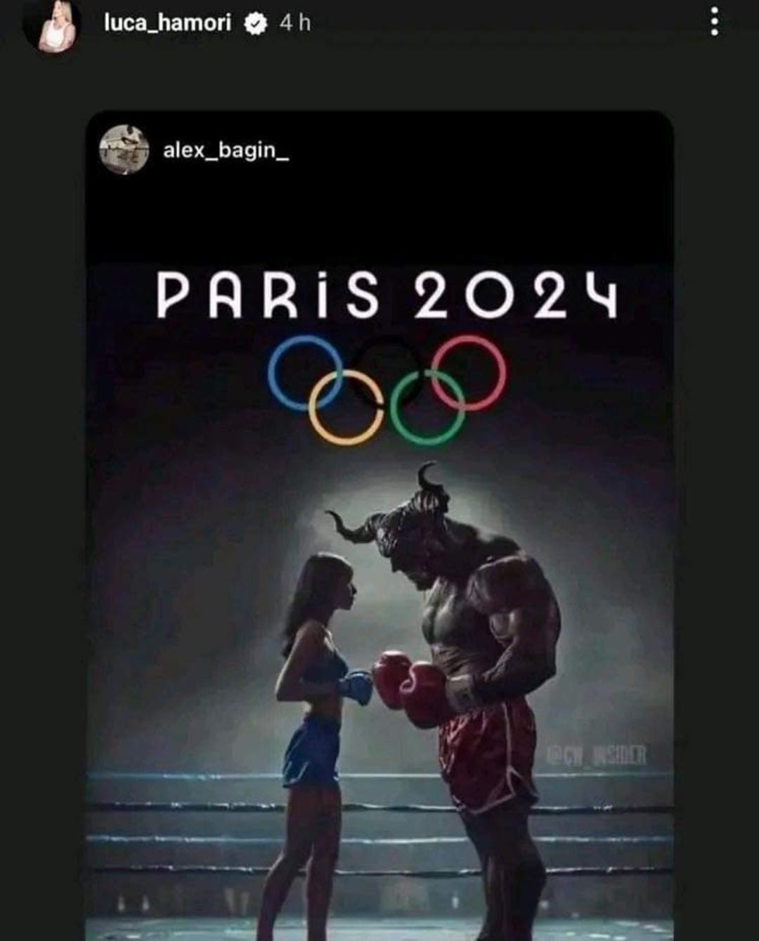 وعلى صفحتها الشخصية على موقع التواصل الاجتماعي إنستجرام، نشرت هاموري، صورة للاعبة ترتدي زيا رياضيا أزرق، في مواجهة وحش ضخم يمتلك قرون طويلة في حلبة الملاكمة، وفي الخلفية تم وضع لوجو الأولمبياد مصحوبة بكلمة أولمبياد باريس 2024.