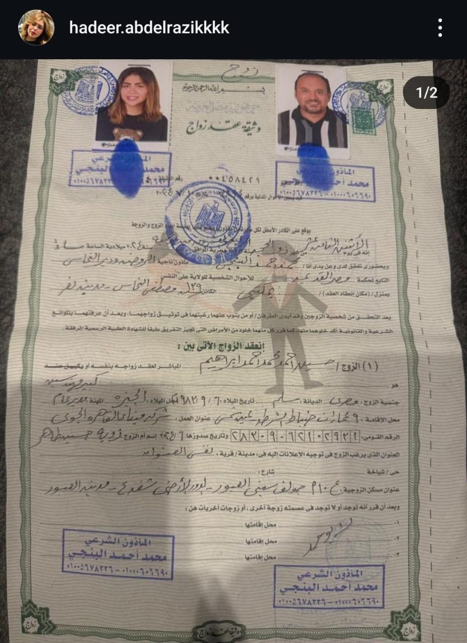 ويأتي ذلك بعد أن نشرت هدير عبد الرازق منشورات عبر حسابها الشخصي على منصة تداول الصور والفيديوهات إنستجرام، تفصح فيها عن زواجها خلال الساعات الماضية، وقد تضمن المنشور عقد الزواج من رجل يُدعى حسين أحمد محمد أحمد إبراهيم.
