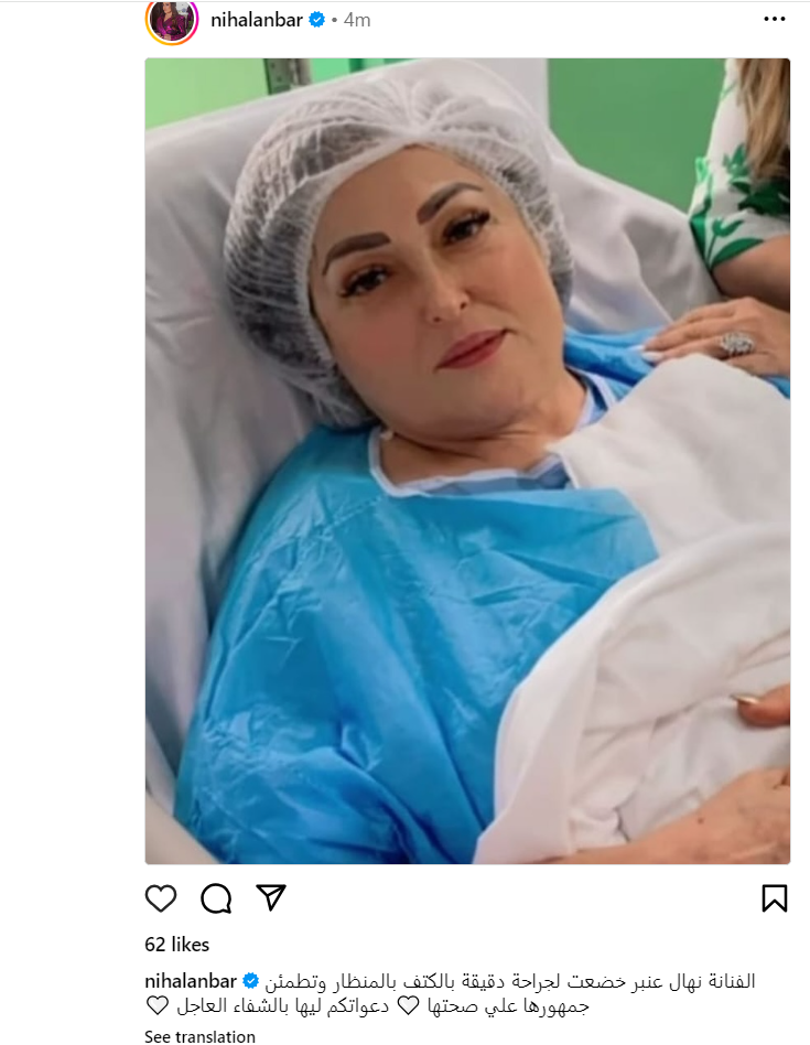ونشرت الصفحة الرسمية للفنانة نهال عنبر بموقع انستجرام، صورة الفنانة بعد خضوعها للعملية مع تعليق: الفنانة نهال عنبر خضعت لجراحة دقيقة بالكتف بالمنظار، وتطمئن جمهورها على صحتها، دعواتكم ليها بالشفاء العاجل.