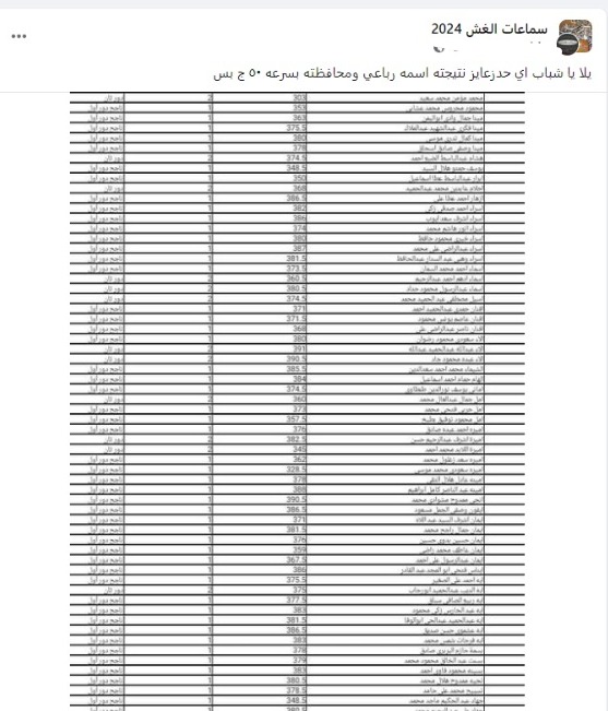 من خلال منشور موحد وعبر أكثر من 20 جروب تعليمي، كتب حساب يحمل اسم علياء. م وآخر باسم أحمد. م، يدعي أن نتيجة الثانوية العامة 2024 موجودة لديهم، مؤكدين أنه من يرغب في النتيجة عليه بتحويل مبلغ مالي لهم، بقولهم: يلا يا شباب أي حد محتاج نتيجته يبعت اسمه الرباعي، ومحافظته بسرعة وبـ50 جنيه بس، الأمر الذي تفاعل معه عدد من أولياء الأمور.