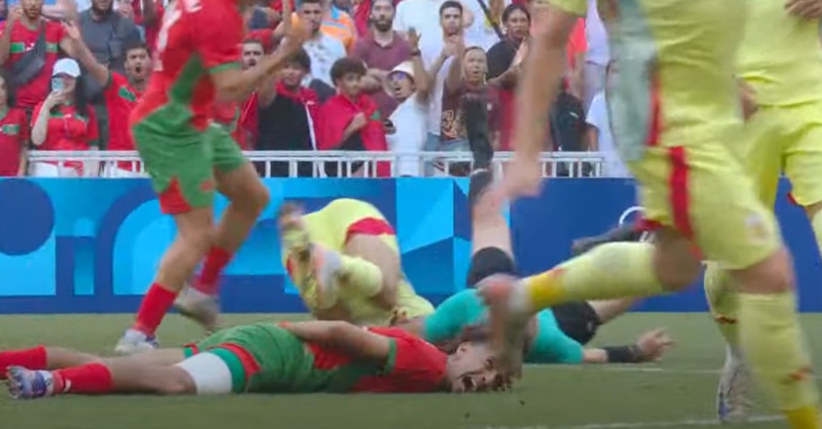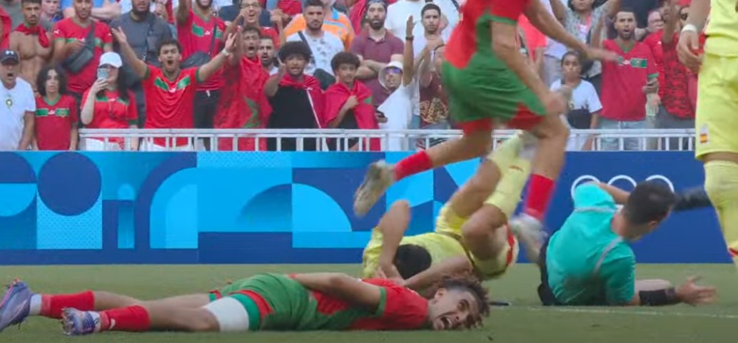 وعقب تدخل من لاعب إسبانيا على لاعب المغرب، سقط حكم مباراة المغرب وإسبانيا في نصف نهائي أولمبياد باريس 2024، وعلى إثر هذا التدخل شعر الحكم بعدم ارتياحية ما أدى إلى مغادرته لملعب المباراة.