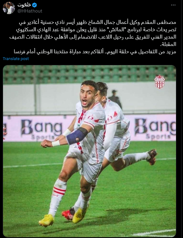 وقال الإعلامي هاني حتحوت عبر حسابه الرسمي على موقع التواصل الاجتماعي إكس: مصطفى المقدم وكيل أعمال جمال الشماخ ظهير أيسر نادي حسنية أغادير يعلن موافقة عبد الهادي السكتيوي المدير الفني للفريق على رحيل اللاعب للانضمام إلى الأهلي خلال انتقالات الصيف المقبلة.