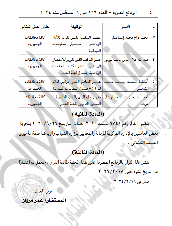 كما أصدر وزير العدل قرارا بأن يلغى القرار رقم 6741 لسنة 2020 الصادر في 29 /9 / 2020 بتخويل بعض العاملين بالإدارة المركزية للرقابة والمعايير بوزارة الشباب والرياضة صفة الضبط القضائي مأموري.