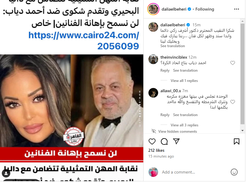 وكتبت داليا البحيري منشورًا، عبر حسابها الشخصي بموقع إنستجرام، قالت فيه: شكرًا النقيب المحترم دكتور أشرف زكي دائمًا وأبدًا سند وظهر لكل فنان.. ربنا يبارك فيك ويخليك لينا.