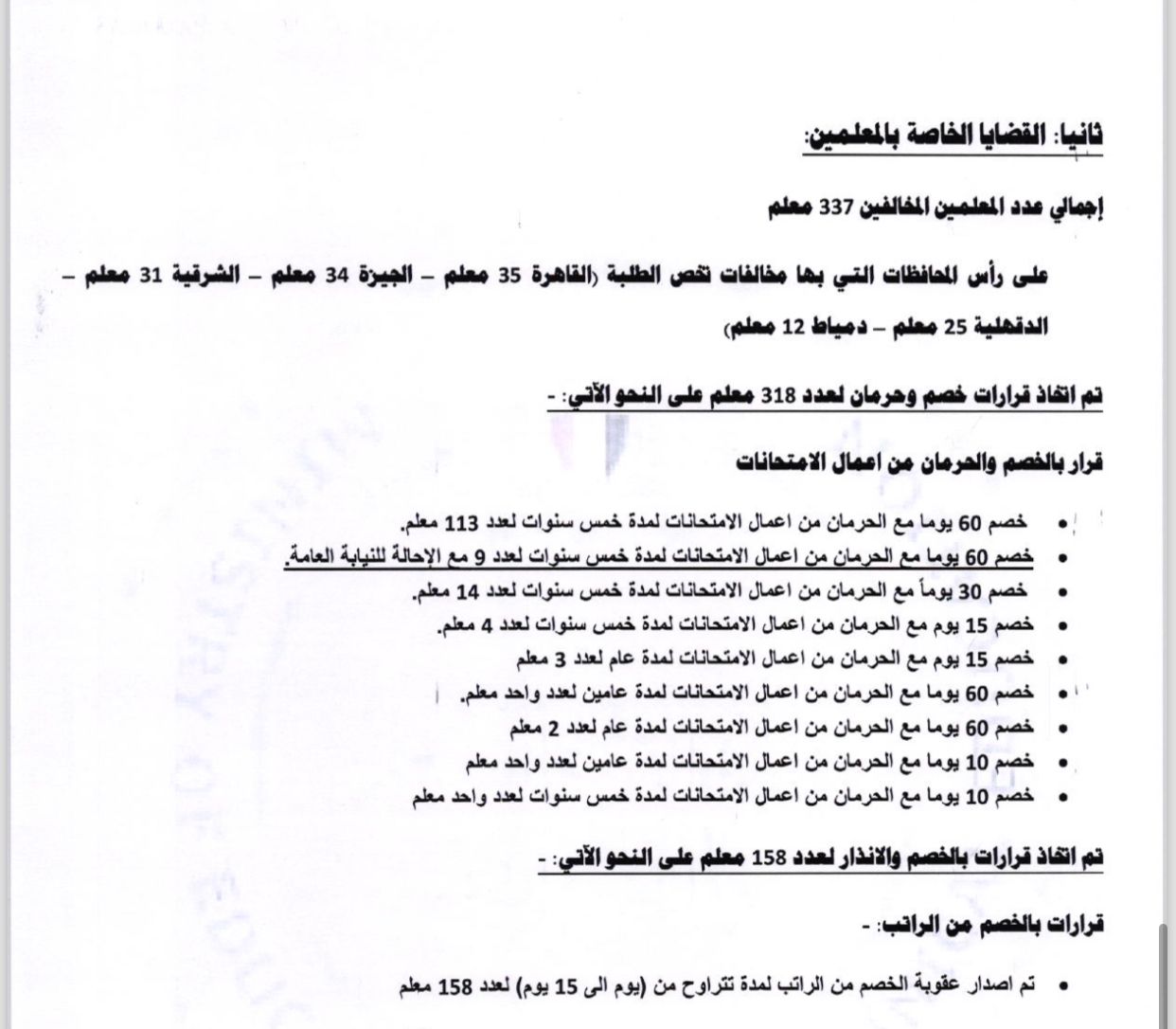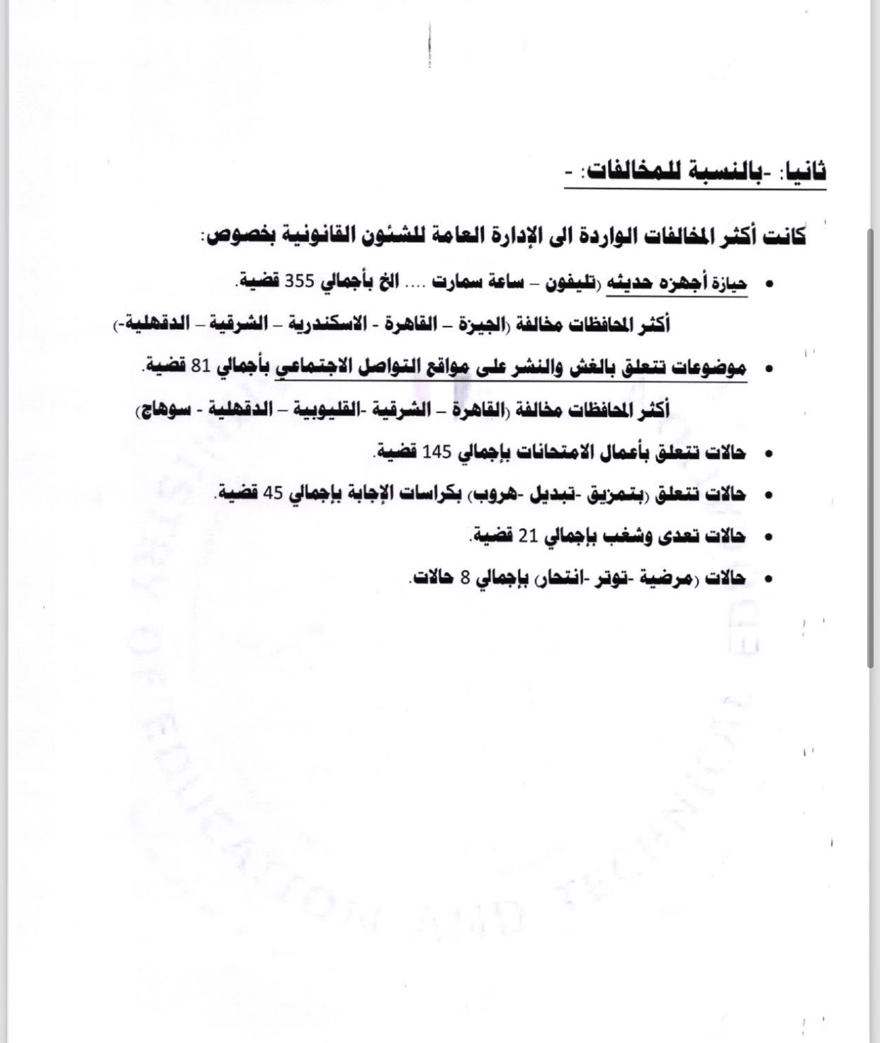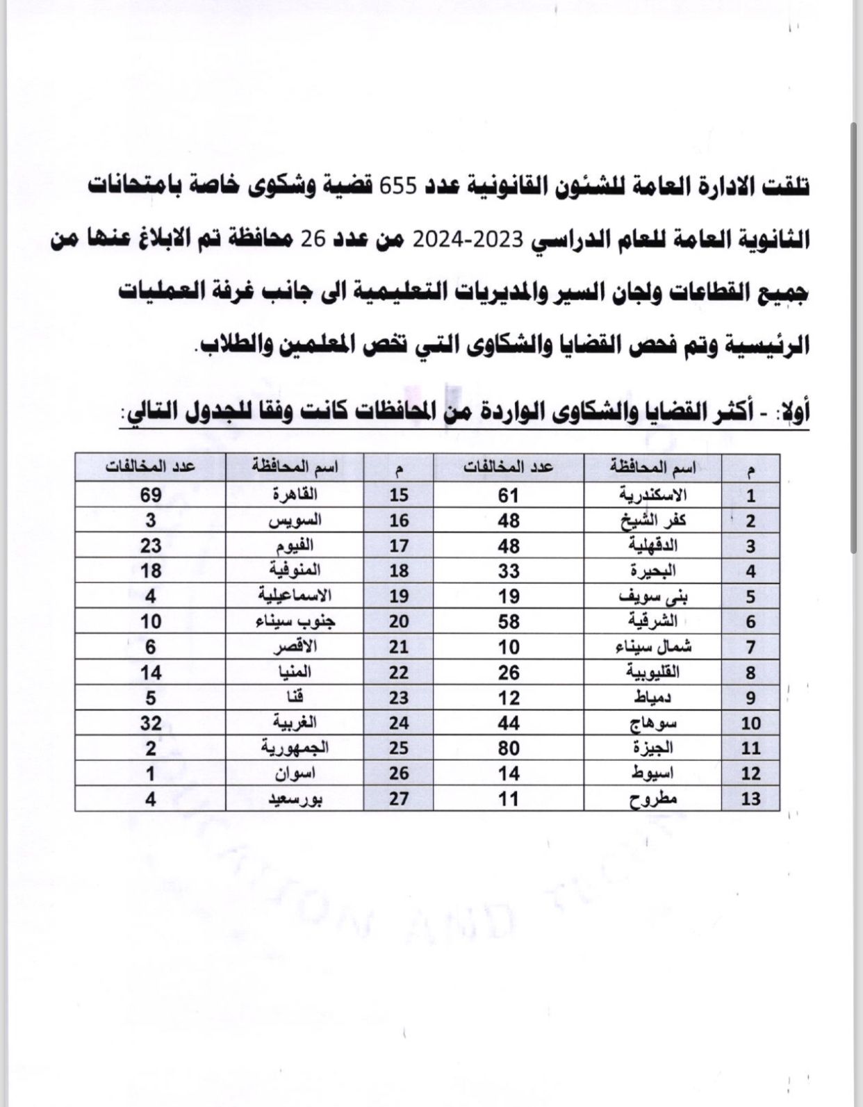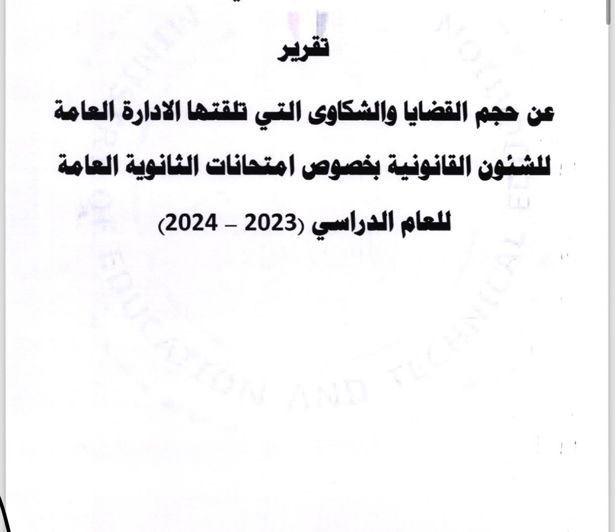 أعلنت وزارة التربية والتعليم والتعليم الفني، حجم القضايا والشكاوى التي تلقتها الإدارة العامة للشئون القانونية بخصوص امتحانات الثانوية العامة للعام الدراسي (2023 - 2024).