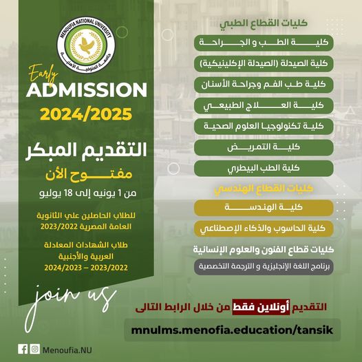 ومن جانبها كانت قد أعلنت الصفحة الرسمية لجامعة المنوفية الأهلية عن فتح باب التقدم لكليات جامعة المنوفية الأهلية للفصل الدراسي الأول للعام الجامعي 2024/2025 للطلاب الحاصلين على الثانوية العامة المصرية دفعة 2022/2023 وطلاب الشهادات المعادلة العربية والأجنبية 2022/2023 – 2023/2024، وذلك خلال الفترة من 1/6/2024 حتى 18/7/2024 مقابل سداد رسوم التقديم 1500 جنيه غير مستردة.