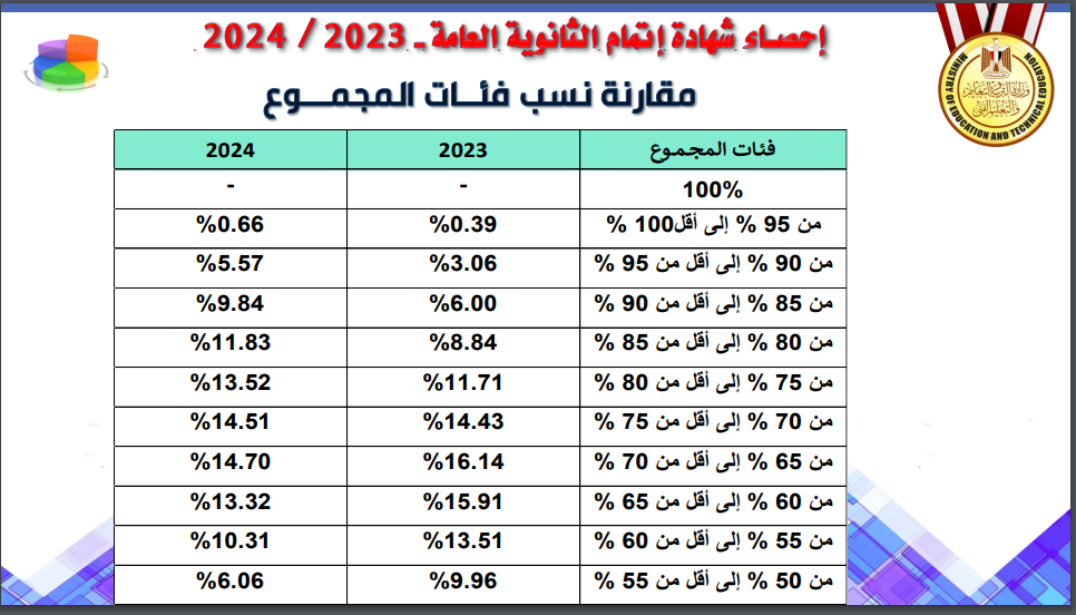 ووصل عدد المتقدمين للامتحانات هذا العام 729835، وعدد الحاضرين 266487، وعدد الناجحين 909925، وبلغ عدد الطلاب الباقين للدور الثاني 96984.