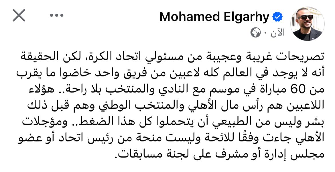 وكتب الجارحي على حسابه الشخصي عبر موقع التواصل الاجتماعي فيس بوك: تصريحات غريبة وعجيبة من مسئولي اتحاد الكرة، لكن الحقيقة أنه لا يوجد في العالم كله لاعبون من فريق واحد خاضوا ما يقرب من 60 مباراة في موسم مع النادي والمنتخب بلا راحة، هؤلاء اللاعبون هم رأس مال الأهلي والمنتخب الوطني وهم قبل ذلك بشر وليس من الطبيعي أن يتحملوا كل هذا الضغط، ومؤجلات الأهلي جاءت وفقًا للائحة وليست منحة من رئيس اتحاد أو عضو مجلس إدارة أو مشرف على لجنة مسابقات.