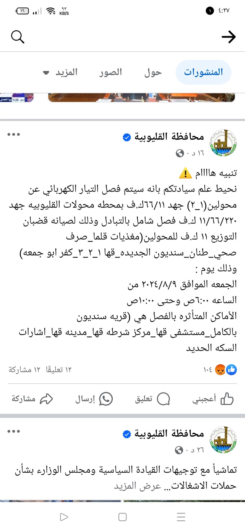 أعلنت محافظة القليوبية اليوم، أنه سيتم فصل التيار الكهربائي عن المحولين (1_2) جهد 66/11ك.ف بمحطة محولات القليوبية جهد 11/66/220 ك.ف فصلا شاملا بالتبادل، وذلك لصيانة قضبان التوزيع 11 ك.ف للمحولين (مغذيات قلما - صرف صحي - طنان - سنديون الجديدة - قها 1_2_3_كفر أبو جمعة، وذلك يوم الجمعه الموافق 2024/8/9 من