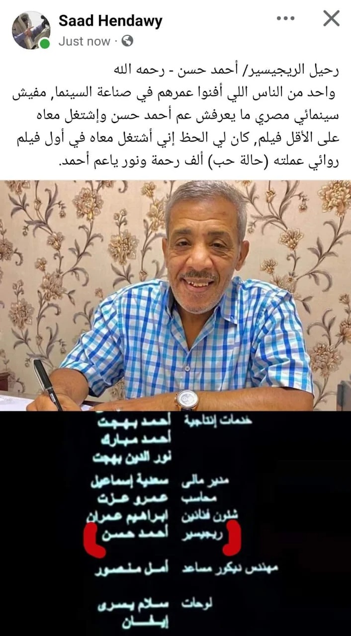 كما نعى المخرج سعد هنداوى، الريجيسير أحمد حسن عبر حسابه بموقع فيس بوك: رحل الريجيسير أحمد حسن، واحد من الناس اللى أفنوا عمرهم فى صناعة السينما، مفيش سينمائى مصري ما يعرفش عم أحمد حسن واشتغل معاه على الأقل فيلم، وكان لى الحظ إنى أشتغل معاه فى أول فيلم روائى عملته (حالة حب)، ألف رحمة ونور يا عم أحمد.