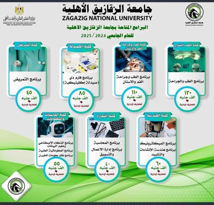 أعلنت جامعة الزقازيق الأهلية، قيمة المصروفات الدراسية للعام الدراسي الجديد 2024-2025، مشيرة إلى أن كلية الطب البشري مصروفاتها تصل لـ 130 ألف جنيه، وكلية طب وجراجة الفم والأسنان مصروفاتها الدراسية تصل لـ 110 آلاف جنيه، وكلية الصيدلة تصل لـ 85 ألف جنيه، وكلية التمريض مصروفاتها تصل لـ 45 ألف جنيه، وكلية الهندسة تصل لـ 60 ألف جنيه.