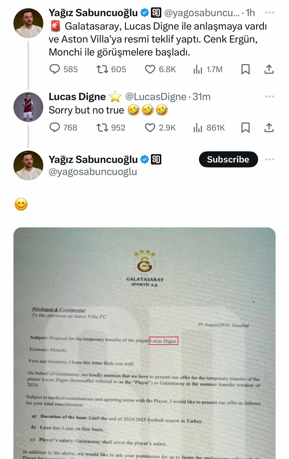 ورد لوكاس على الصحفي التركي في منشور قال فيه: آسف ولكن هذا ليس صحيحًا، ليرد الصحفي التركي على منشور اللاعب بمنشور آخر تظهر فيه صورة وثيقة تفيد بأن النادي التركي أرسل بالفعل عرضًا إلى نادي أستون فيلا من أجل ضم اللاعب في الفترة المقبلة.