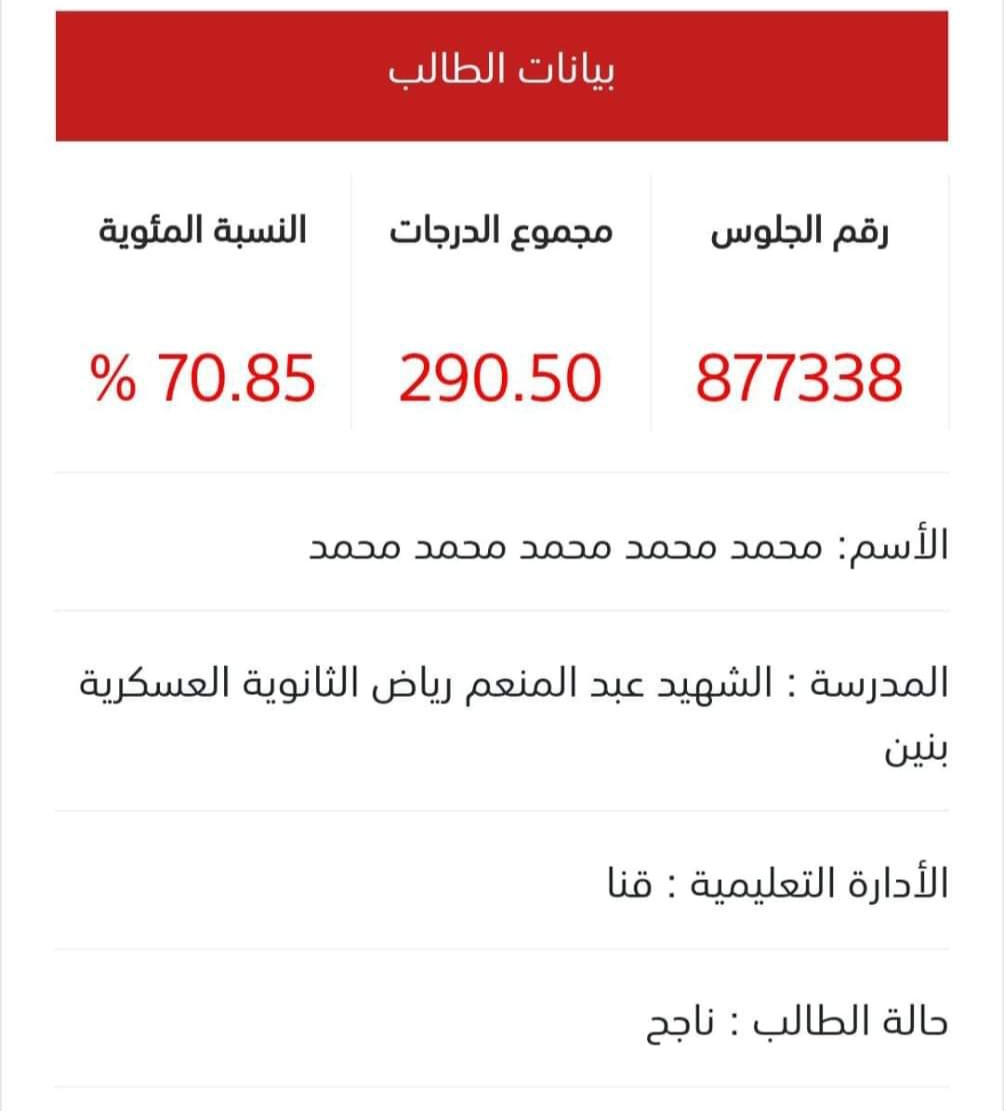 أثارت نتيجة طالب ثانوية عامة في محافظة قنا حالة من الجدل والانتشار عبر مواقع التواصل الاجتماعي، بسبب اسمه المكرر حتى الاسم الخامس محمد محمد محمد محمد محمد، وكان اسمه سببًا في انتشار نتيجته.
