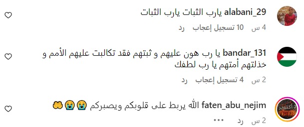 ومتابع آخر: الله يربط على قلوبكم ويصبركم، وأضاف أخر: لا حول ولا قوة إلا بالله يارب الصبر يارب، وأخر: يالله سلاما على فلسطين حتى يطمئن فؤادها.