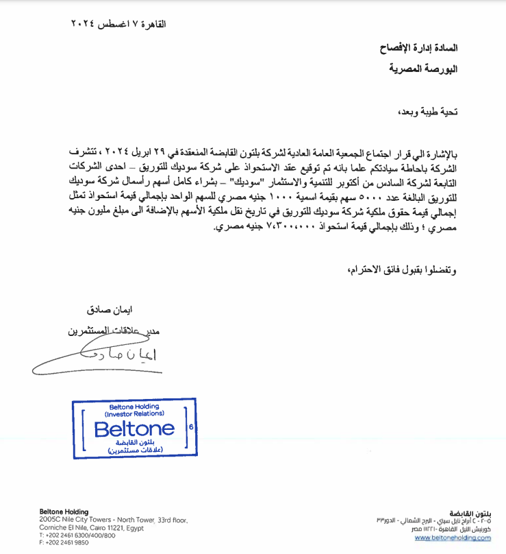 وجاء رد بلتون في بيان مرسل للبورصة اليوم كالتالي: بالإشارة إلى قرار اجتماع الجمعية العامة العادية لشركة بلتون القابضة المنعقدة في 29 أبريل 2024، تتشرف الشركة بإحاطتكم علما بأنه تم توقيع عقد الاستحواذ على شركة سوديك للتوريق - إحدى الشركات التابعة لشركة السادس من أكتوبر للتنمية والاستثمار سوديك - بشراء كامل أسهم رأسمال شركة سوديك للتوريق البالغة عدد 5000 سهم بقيمة إسمية 1000 جنيه مصري للسهم الواحد بإجمالي قيمة استحواذ تمثل إجمالي قيمة حقوق ملكية شركة سوديك للتوريق في تاريخ نقل ملكية الأسهم بالإضافة إلى مبلغ مليون جنيه، وذلك بإجمالي قيمة استحواذ 7 ملايين و300 ألف جنيه.