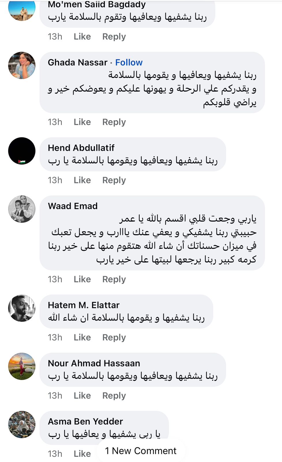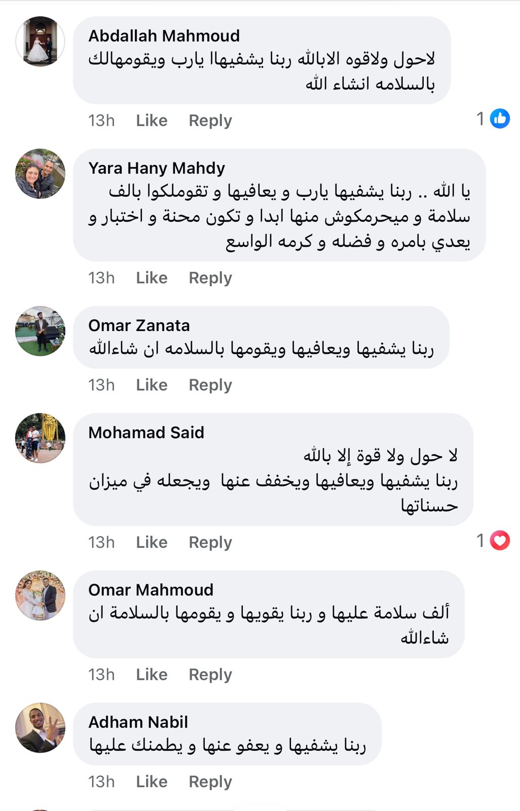 وعلق آخرون: ربنا يطمنك عليها وتقوم بألف سلامة يا الله.. وميحرمكوش منها أبدا وتكون محنة واختبار ويعدي بأمره وفضله وكرمه الواسع.