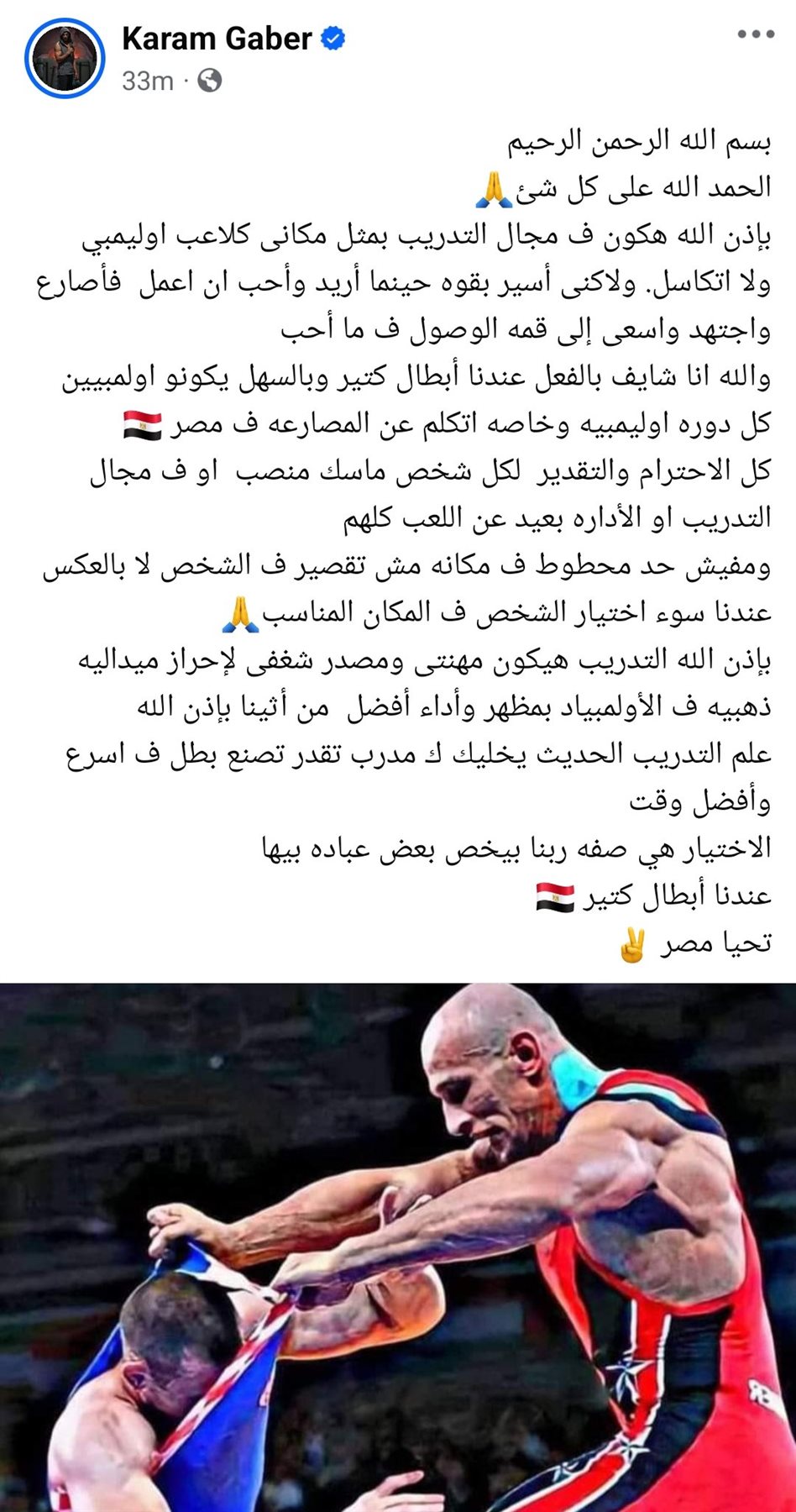 وكتب كرم جابر عبر حسابه الشخصي على فيسبوك: بسم الله الرحمن الرحيم، الحمد الله على كل شيء، بإذن الله هكون في مجال التدريب بمثل مكاني كلاعب أولمبي ولا أتكاسل، ولكني أسير بقوة حينما أريد وأحب أن أعمل، فأصارع وأجتهد وأسعى إلى قمة الوصول فيما أحب.