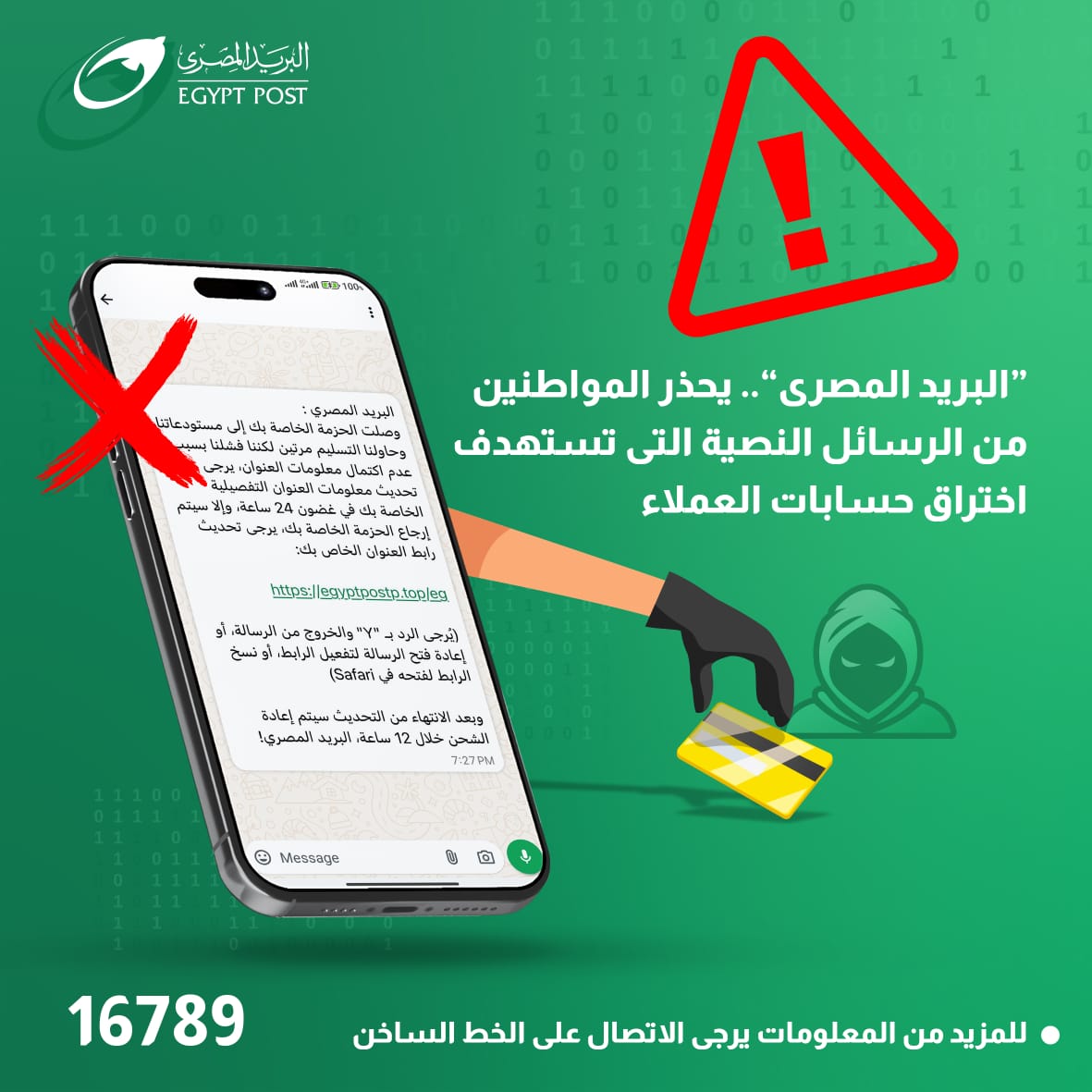 وأوضحت هيئة البريد أن جميع هذه الرسائل ليست صادرة من البريد المصري، مؤكدة أنه لم ولن يُطلب من العملاء أي بياناتٍ تفصيليةٍ خاصةٍ بحساباتهم أو مقر إقامتهم، أو دفع مصاريف شحن، أو أي رسومٍ أخرى عبر الهاتف المحمول أو الرسائل النصية.