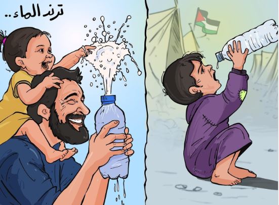 ونشر المصور الفلسطيني محمود عباس عبر حسابه على الإنستجرام، صورة من الترند تضمنت أب حامل ابنته ويبعثر الماء، ولكن الطفل الفلسطيني من جهة أخرى يستنزف آخر قطرات المياه في الزجاجة.