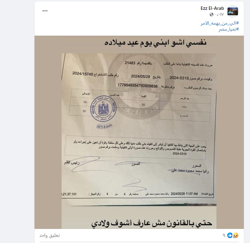 وعلق محمد عز العرب على صورة نشرها عبر حسابه الشخصي على موقع التواصل الاجتماعي فيس بوك: إلى من يهمه الأمر.. نفسي أشوف ابني في عيد ميلاده، حتى بالقانون مش عارف أشوف ولادي.