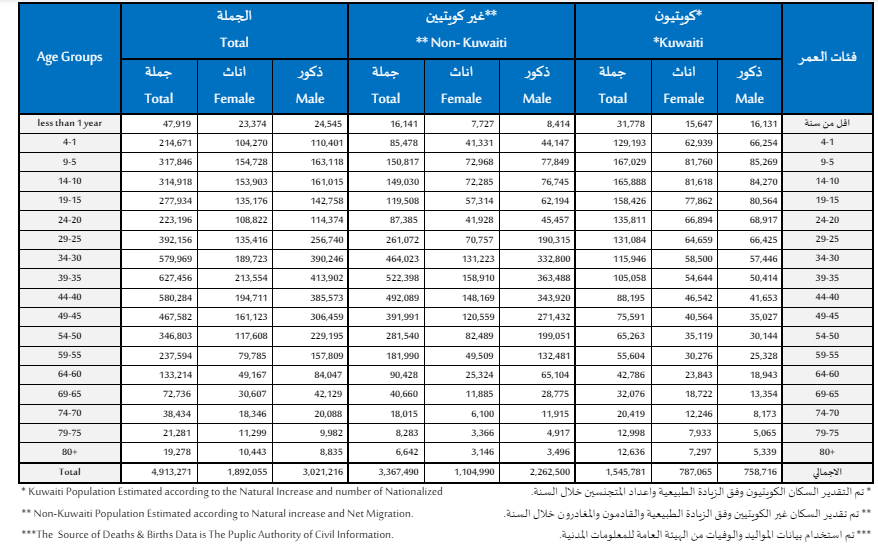 ويبلغ عدد الكويتيين الأصل 1.546 مليون نسمة بالفترة المذكورة 31.47% من إجمالي عدد سكان الدولة الخليجية، ووزعوا بين 758.72 ألف نسمة من الذكور، و787.06 ألف نسمة من الإناث.