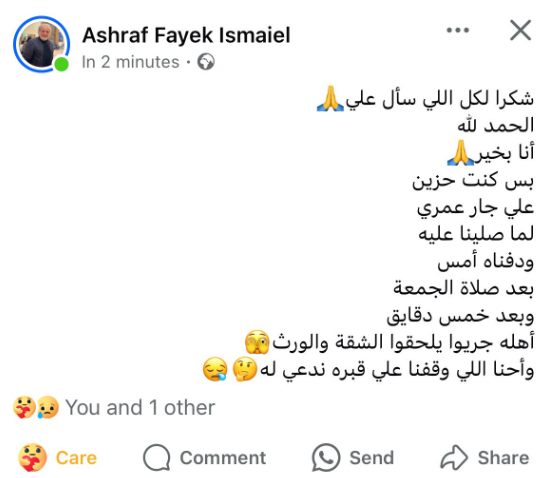 وكتب أشرف فايق منشورًا، عبر حسابه الشخصي بموقع التواصل الاجتماعي فيس بوك، قال فيه: شكرًا لكل اللي قلق وسأل علي الحمد لله أنا بخير، بس كنت حزين على جار عمري لما صلينا عليه ودفناه، وبعد خمس دقايق أهله جريوا يلحقوا الشقة والورث، وإحنا اللي وقفنا على قبره ندعي له.