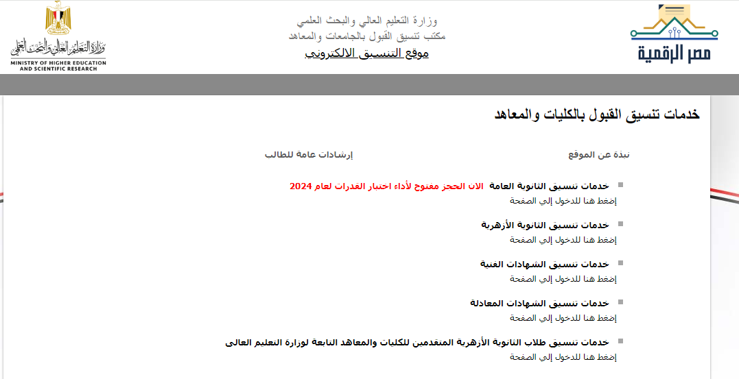 ويمكن لطلاب الثانوية العامة الدخول على موقع التنسيق الإلكتروني 2024 من هنـــــــــــــــا، عن طريق الحاسوب الشخصي للطالب والمتصل بالإنترنت طوال مدة مرحلة التنسيق وعلى مدار 24 ساعة متوصل، كما يمكن الدخول على موقع التنسيق من معامل الحاسبات في الجامعات الحكومية من التاسعة صباحا حتى الثالثة عصرا طوال مدة المرحلة.