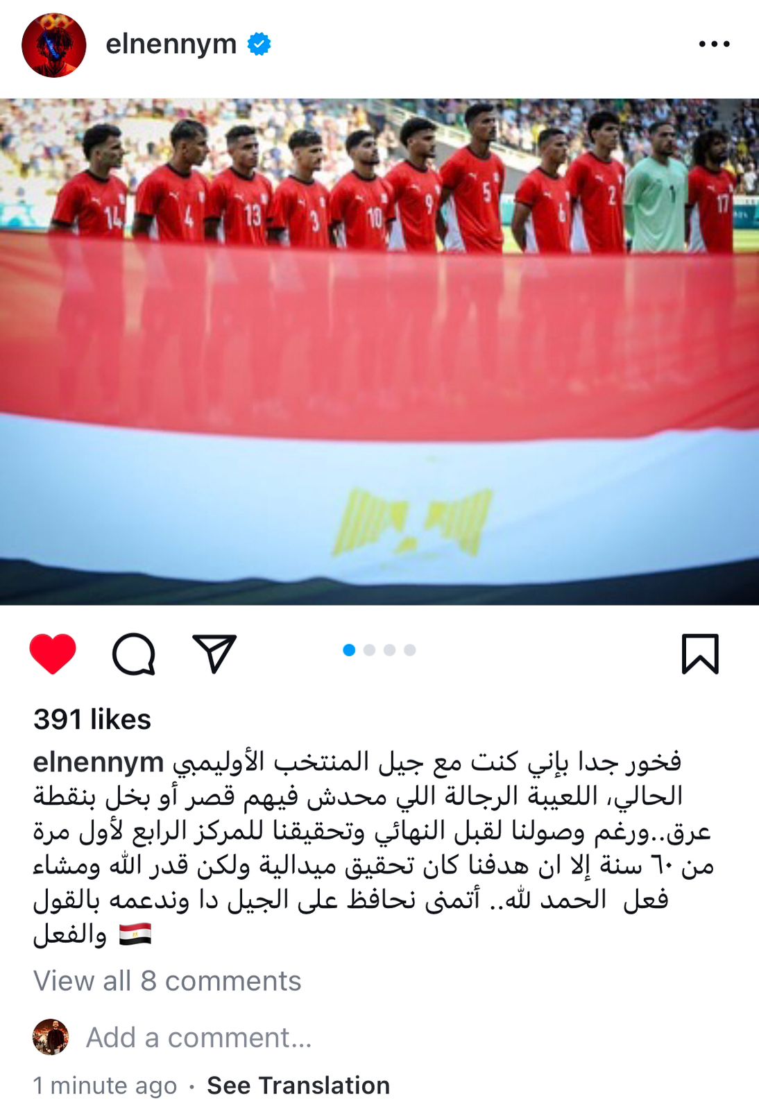 ونشر محمد النني عبر حسابه الرسمي على موقع التواصل الإجتماعي إنستجرام، صورة له رفقة المنتخب الأولمبي، وعلق عليها: فخور جدا بإني كنت مع جيل المنتخب الأولمبي الحالي، اللعيبة الرجالة اللي محدش فيهم قصر أو بخل بنقطة عرق.. ورغم وصولنا لقبل النهائي وتحقيقنا للمركز الرابع لأول مرة من 60 سنة إلا أن هدفنا كان تحقيق ميدالية ولكن قدر الله وما شاء فعل الحمد لله.. أتمنى نحافظ على الجيل دا وندعمه بالقول والفعل.
