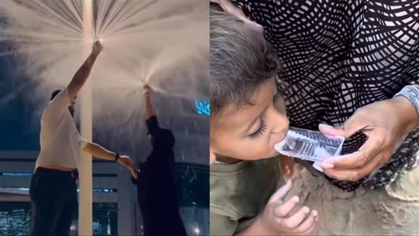 تضمن مقطع الفيديو صغير السيدة الفلسطينية، وهو حافي القدمين يشعر بالعطش منتظرًا والدته أن تجمع له قطرات المياه.