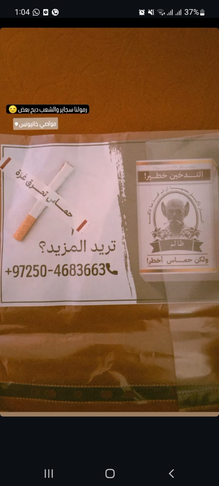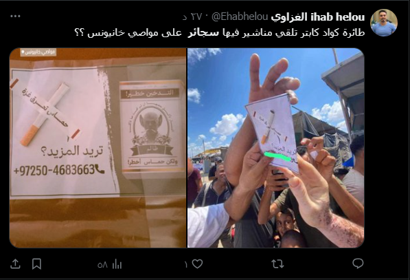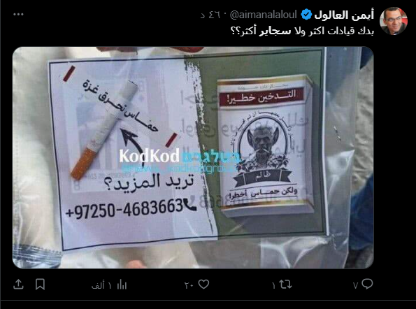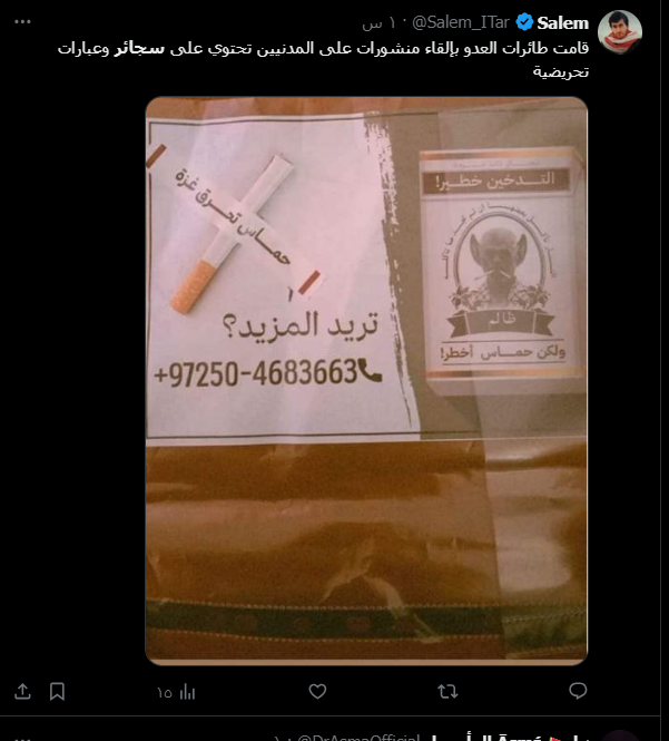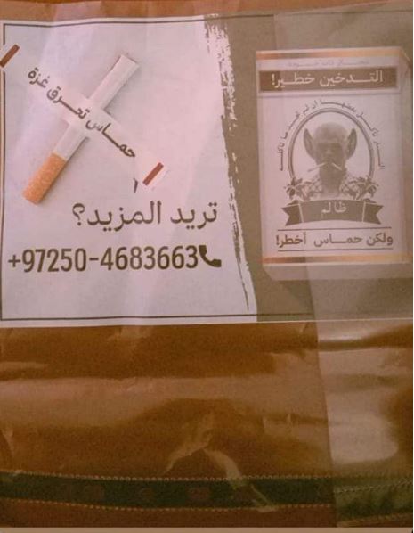 وأرفقت قوات الاحتلال صورة تظهر يحيى السنوار رئيس حركة حماس، بشكل غير لائق، إلى جانب عبارات تقول: “تريد دخان ولا قيادات”، كما طالبت قوات الاحتلال مواطني قطاع غزة بالتواصل مع إسرائيل عبر رقم هاتفي على تلك المنشورات.