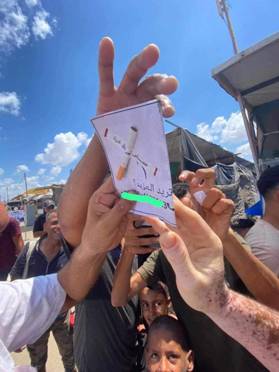 ألقت قوات الاحتلال الإسرائيلي منشورات تتضمن صورة لرئيس حركة حماس الجديد يحيى السنوار، مرفق معها سيجارة، في خطوة لدفع مواطني القطاع على التقاط المنشورات للحصول على السجائر، وذلك في ظل ما يشهده القطاع من نقص كبير في كافة المنتجات، حسبما تداول مستخدمو مواقع التواصل الاجتماعي في قطاع غزة.