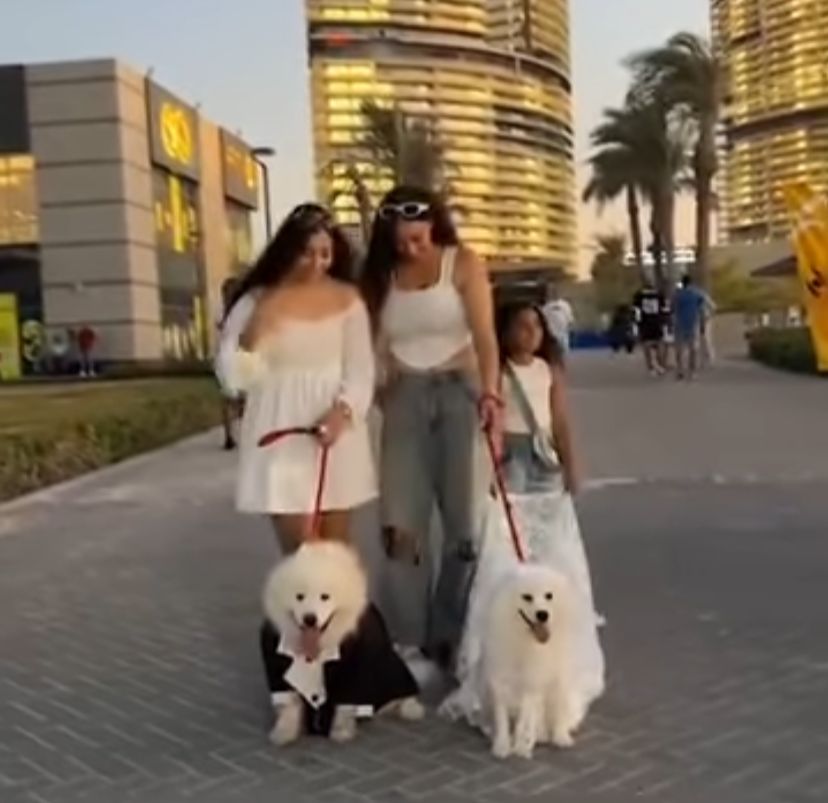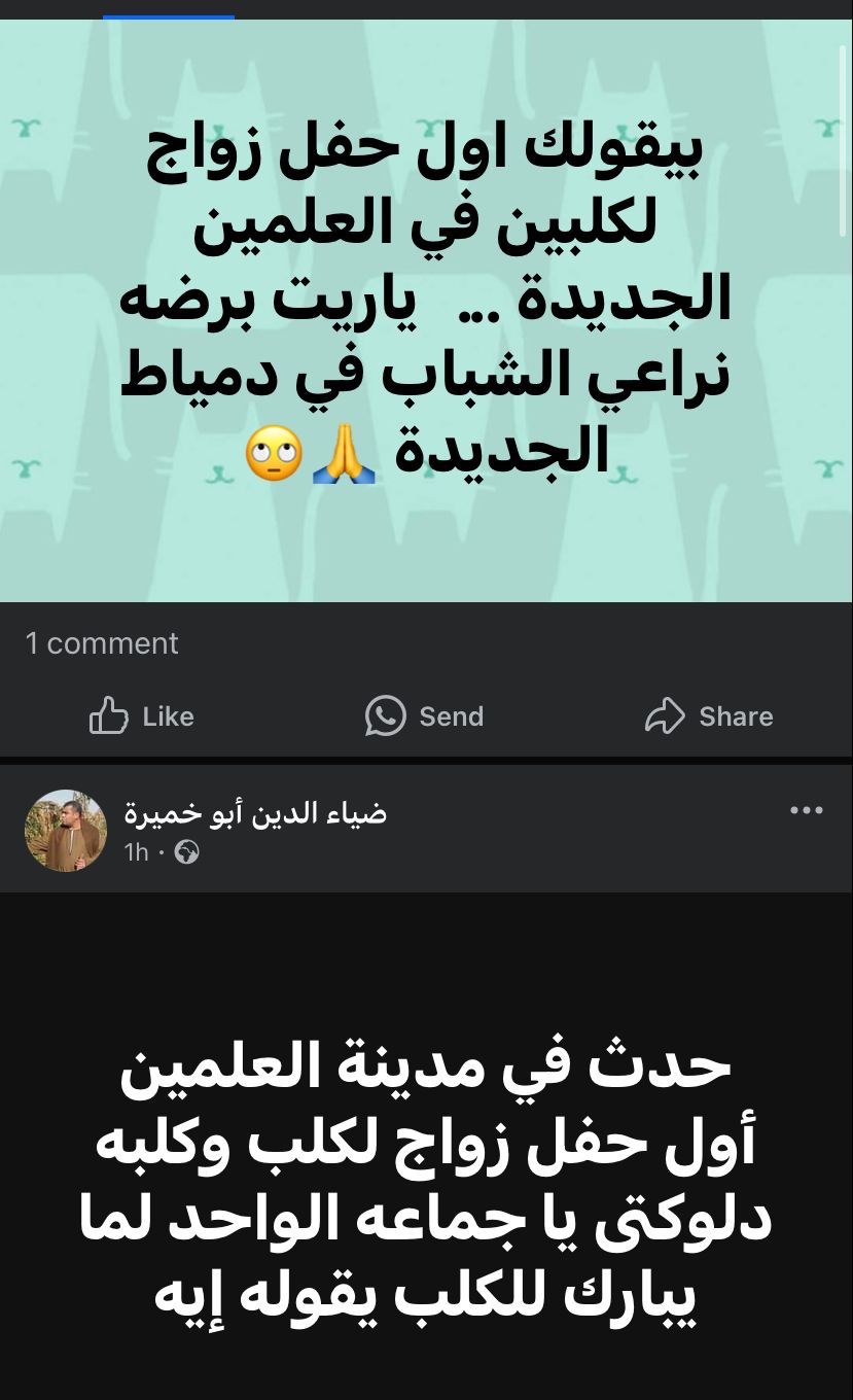تداول مستخدمو مواقع التواصل الاجتماعي، مقطع فيديو عبر فيسبوك، لكلبين بملابس الزفاف في مدينة العلمين الجديدة، حيث ظهرت الكلبة مرتدية فستان تول باللون الأبيض، وكان الكلب ببدلة الزفاف يرتدي ببيونة.