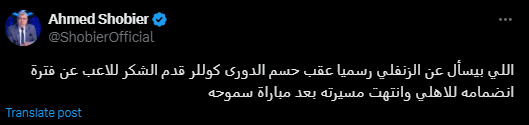 وكتب أحمد شوبير عبر حسابه الرسمي على موقع التواصل الاجتماعي إكس: اللي بيسأل عن محمود الزنفلي؛ رسميا عقب حسم الدوري كولر قدّم الشكر للاعب عن فترة انضمامه للأهلي وانتهت مسيرته بعد مباراة سموحة.