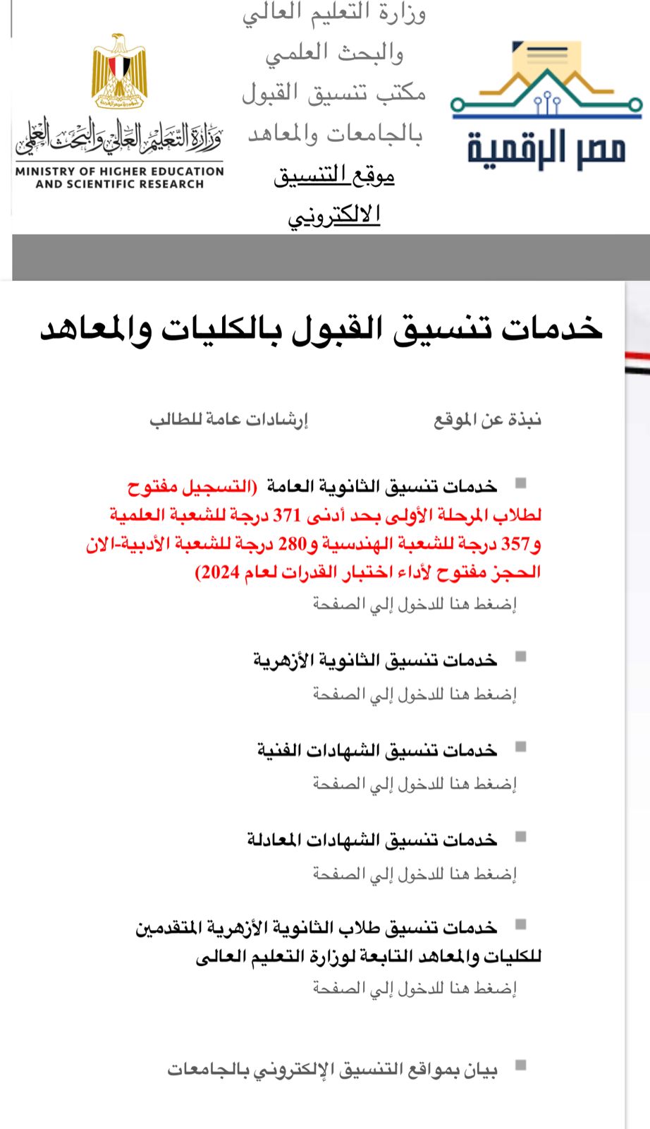 فتح منذ قليل، موقع التنسيق الإلكتروني باب التسجيل في المرحلة الأولى من تنسيق الجامعات العام الجامعي 2024- 2025 لطلاب الثانوية العامة عبر الموقع الإلكتروني للتنسيق، حيث ظهرت جملة: التسجيل مفتوح لطلاب المرحلة الأولى بحد أدنى 371 درجة للشعبة العلمية و357 درجة للشعبة الهندسية و280 درجة للشعبة الأدبية-الان الحجز مفتوح لأداء اختبار القدرات لعام 2024.