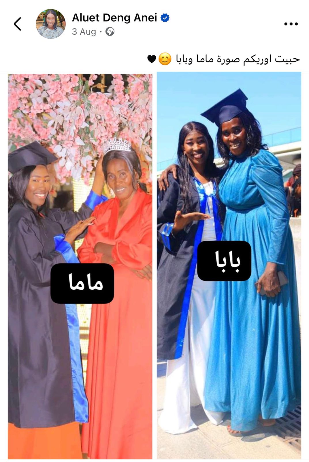 نشرت فتاة سودانية تُدعى Aluet Deng Anei، عبر حسابها الشخصي على منصة فيس بوك للتواصل الاجتماعي، منشورًا تناشد رواد السوشيال ميديا بالتوقف عن التنمر على صورتها مع والدتها خاصة بعد أن شاركتهم بصورتها معها خلال حفلة تخرجها، وتداولت التعليقات بأن أمها تشبه الرجال زاعمة بأنها متحولة جنسيًا.